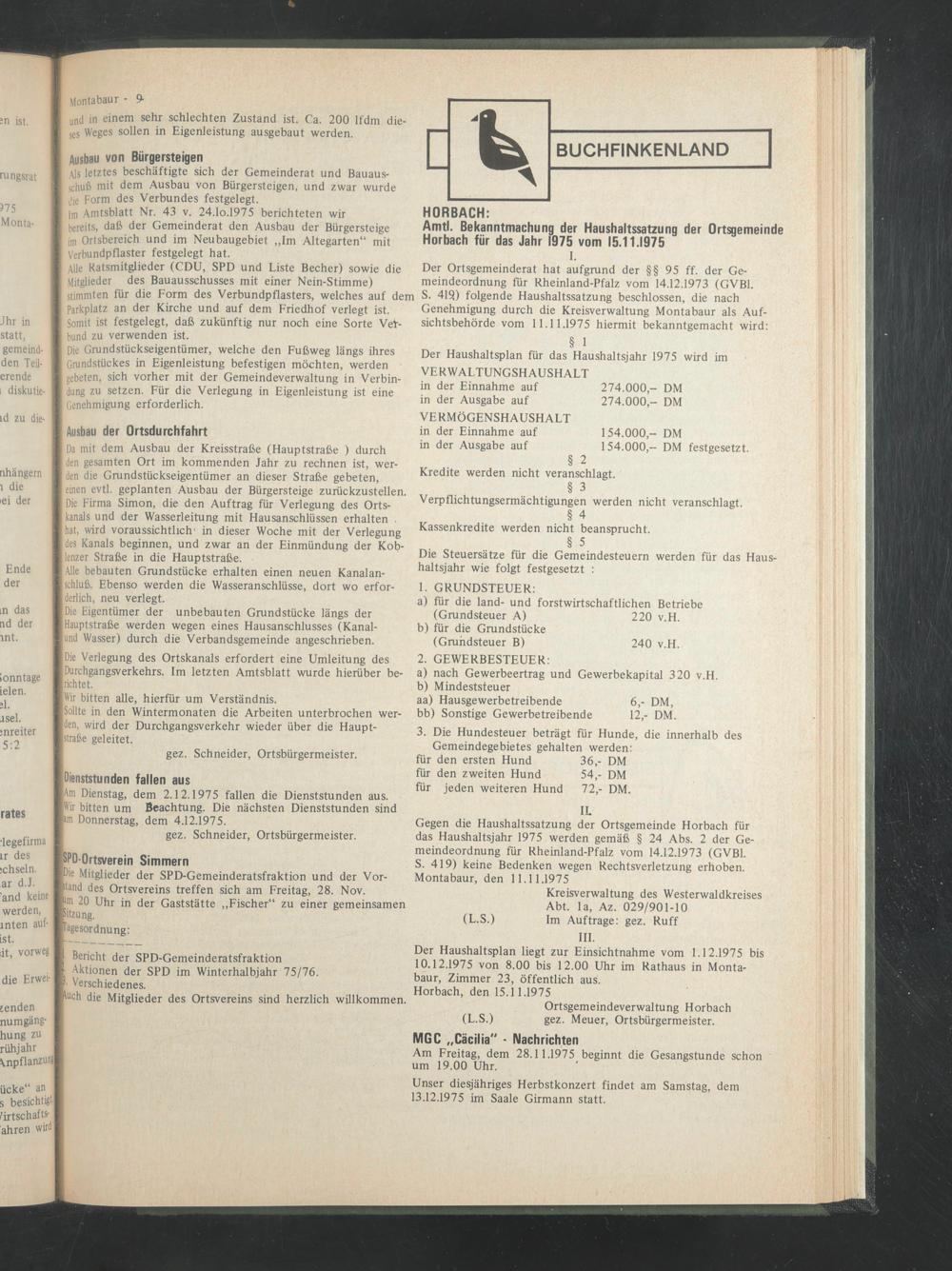 Amtl. Bekanntmachung der Haushaltssatzung der Ortsgemeinde Horbach für das Jahr 1975 vom 15.11.1975