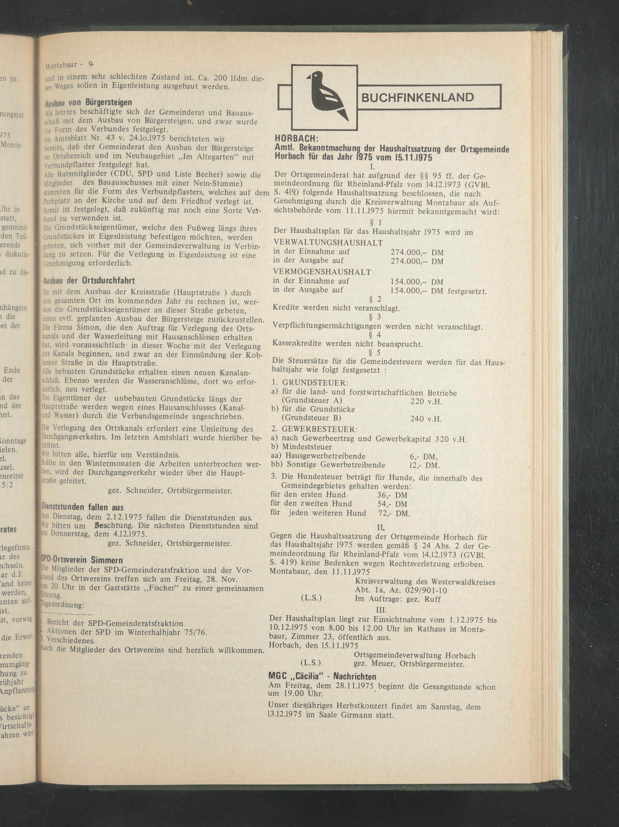 S. 419) folgende Haushaltssatzung beschlossen, die nach Genehmigung durch die Kreisverwaltung Montabaur als Aufsichtsbehörde vom 11.11.1975 hiermit bekanntgemacht wird: