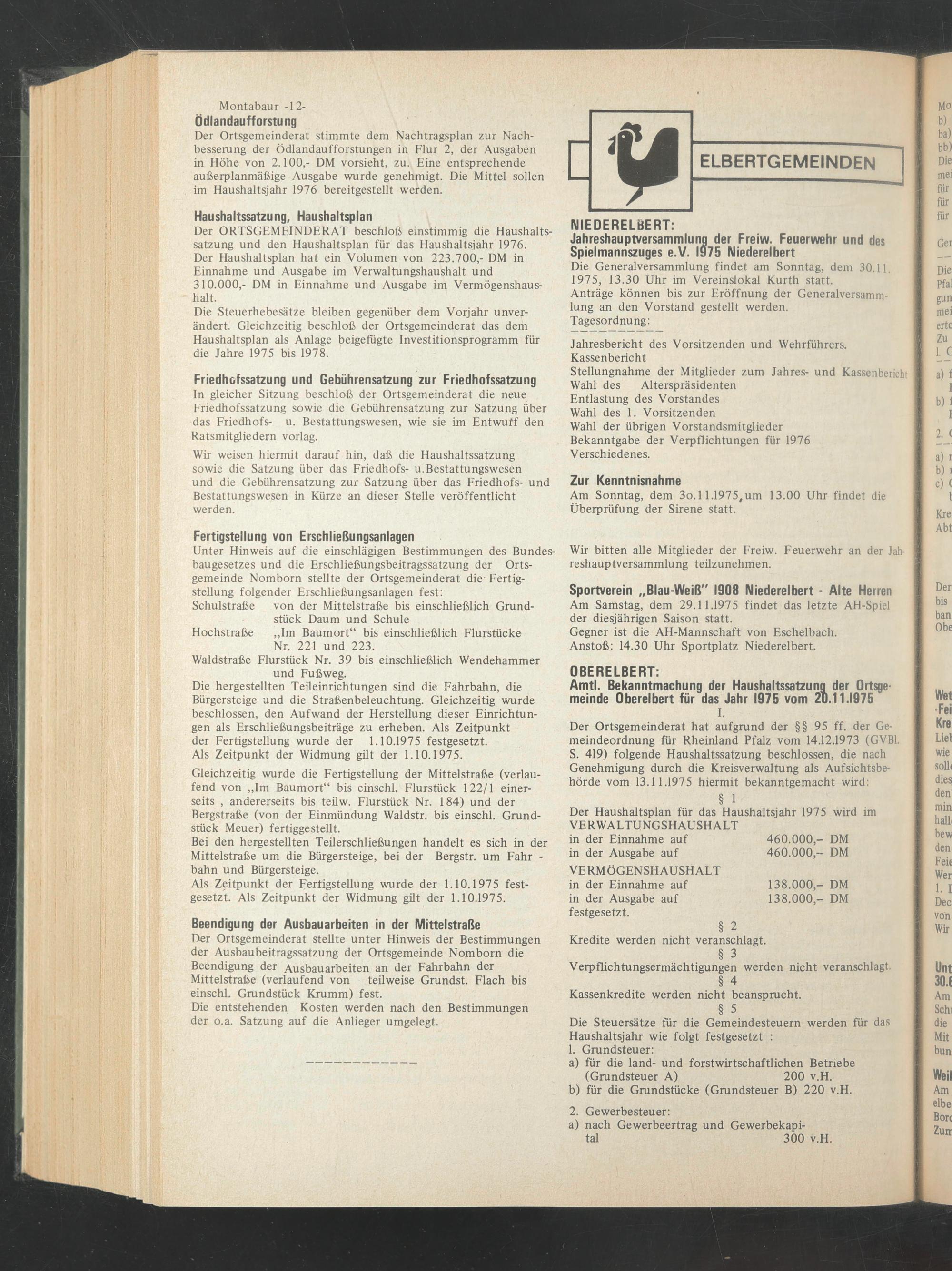 Amtl. Bekanntmachung der Haushaltssatzung der Ortsgemeinde Oberelbert für das Jahr 1975 vom 20.11.1975