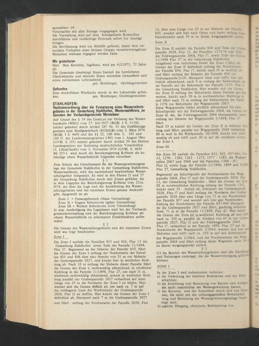 Zum Schutz des Grundwassers für die Wassergewinnungsanlage der Gemeinde Stahlhofen in der Gemarkung Stahlhofen, Westerwaldkreis, wird das nachstehend beschriebene Wasserschutzgebiet festgesetzt. Es wird in den Fluren 12 und 27 der Gemarkung Stahlhofen durch drei Zonen gebildet, die in dem Lageplan der Bezirksregierung Koblenz vom 25.1o. 1974, der über die Lage und die Ausdehnung des Wasserschutzgebietes und der einzelnen Zonen genaue Auskunft gibt, dargestellt ist als