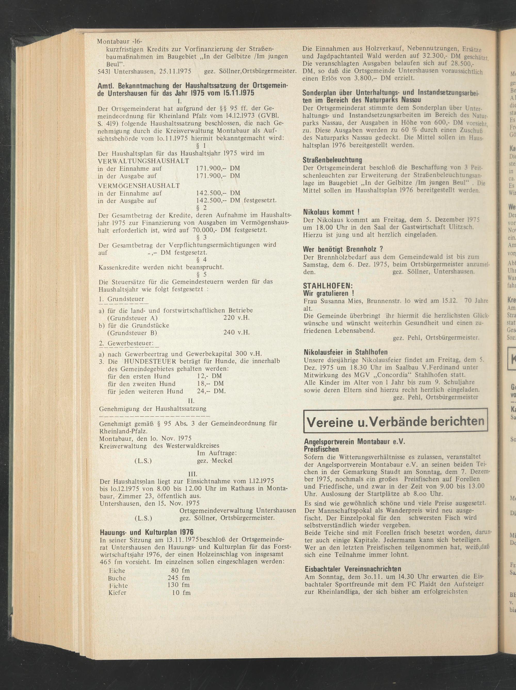 Der Brennhblzbedarf aus dem Gemeindewald ist bis zum Samstag, dem 6. Dez. 1975, beim Ortsbürgermeister anzumelden. gez. Söllner, Untershausen.