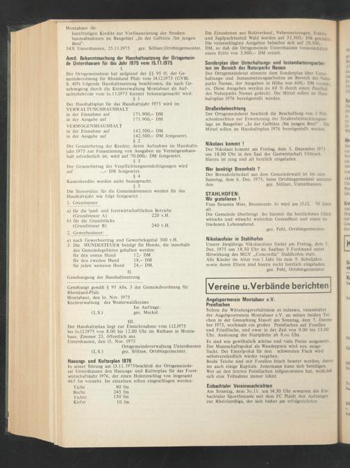 Der Haushaltsplan liegt zur Einsichtnahme vom 1.12.1975 bis lo.12.1975 von 8.00 bis 12.00 Uhr im Rathaus in Montabaur, Zimmer 23, öffentlich aus.