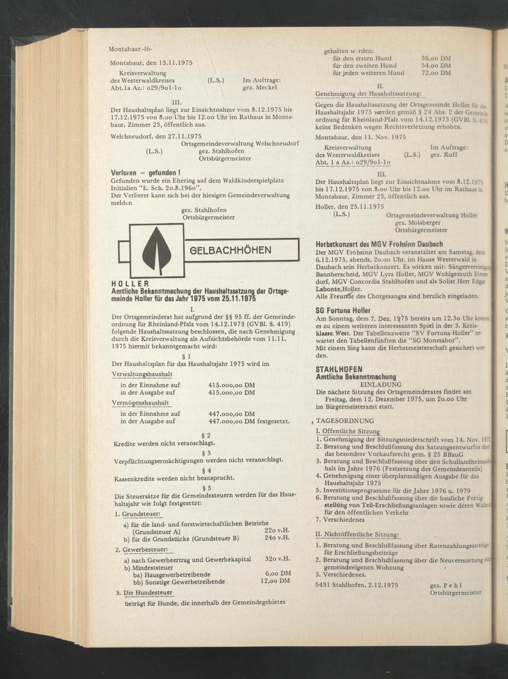 Amtliche Bekanntmachung der Haushaltssatzung der Ortsgemeinde Holler für das Jahr 1975 vom 25.11.1975