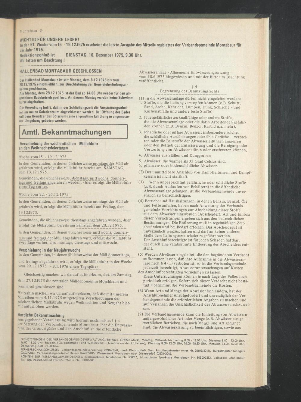 In der 51. Woche vom I5. - 19.12.1975 erscheint die letzte Ausgabe des Mitteilungsblattes der Verbandsgemeinde Montabaur für das Jahr 1975.
