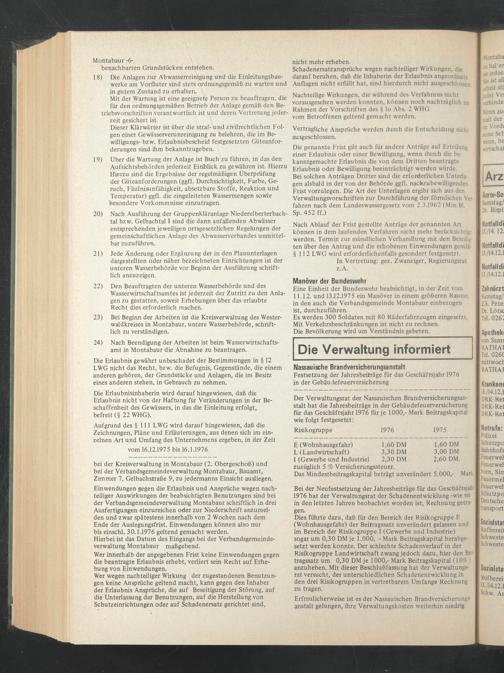 Einwendungen gegen die Erlaubnis und Ansprüche wegen nachteiliger Auswirkungen der beabsichtigten Benutzungen sind bei der Verbandsgemeindeverwaltung Montabaur schriftlich in drei Ausfertigungen einzureichen oder zur Niederschrift anzumelden und zwar spätestens innerhalb von 2 Wochen nach dem Ende der Auslegungsfrist. Einwendungen können also nur bis einschl. 30.1.1976 geltend gemacht werden.