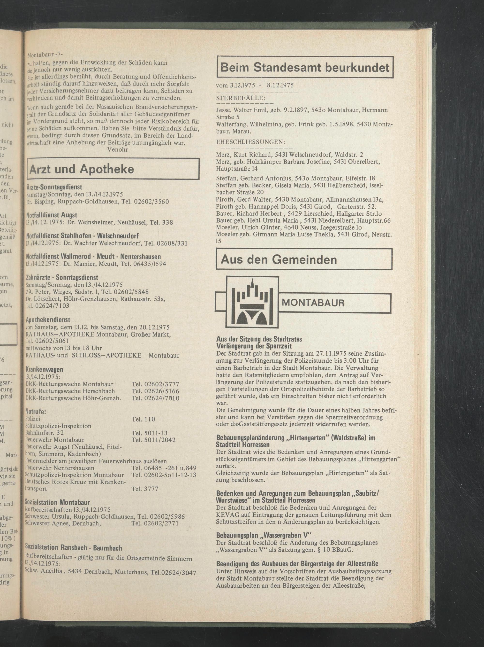 Samstag/Sonntag, den 13./14.12.1975 ZÄ. Peter, Wirges, Südstr. 1, Tel. 02602/5848 Dr. Lötschert, Höhr-Grenzhausen, Rathausstr. 53a,