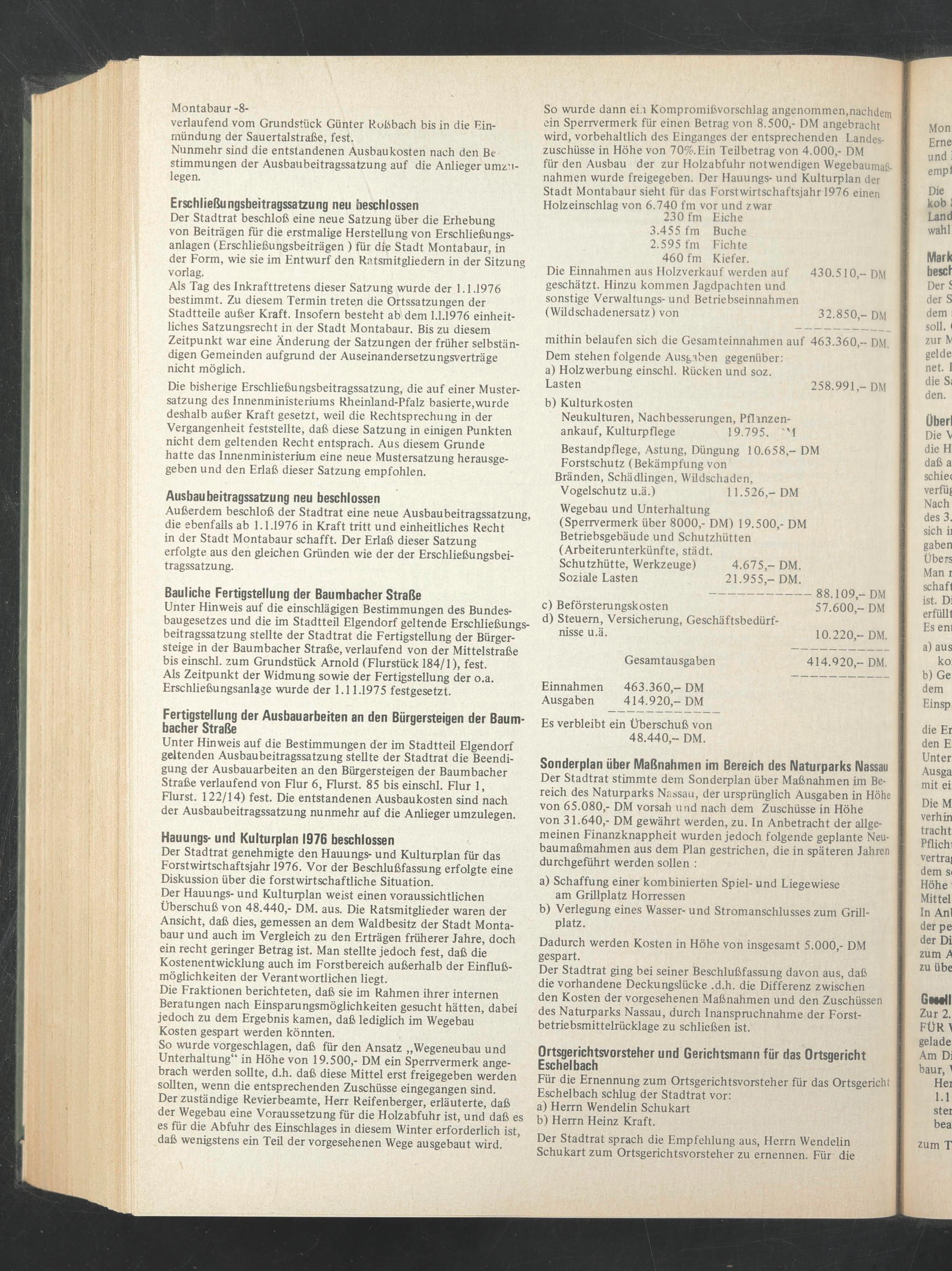 So wurde dann ei.i Kompromißvorschlag angenommen,nachdem ein Sperrvermerk für einen Betrag von 8.500,- DM angebracht wird, vorbehaltlich des Einganges der entsprechenden Landeszuschüsse in Höhe von 70%.Ein Teilbetrag von 4.000,- DM für den Ausbau der zur Holzabfuhr notwendigen Wegebaumaßnahmen wurde freigegeben. Der Hauungs- und Kulturplan der Stadt Montabaur sieht für das Forstwirtschaftsjahr 1976 einen Holzeinschlag von 6.740 fm vor und zwar 230 fm Eiche 3.455 fm Buche 2.595 fm Fichte 460 fm Kiefer.