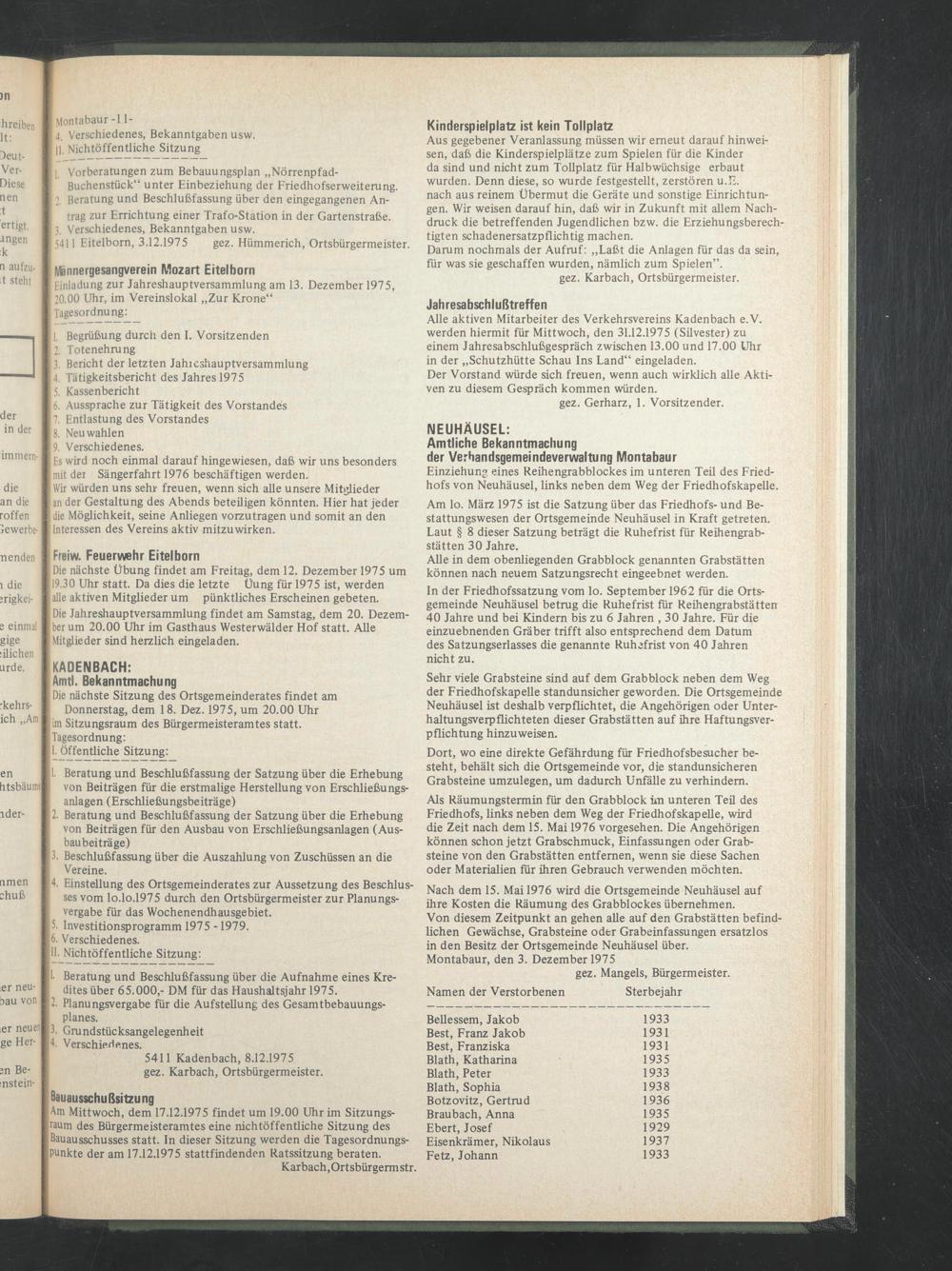 | Die nächste Sitzung des Ortsgemeinderates findet am Donnerstag, dem 18. Dez. 1975, um 20.00 Uhr lim Sitzungsraum des Bürgermeisteramtes statt.