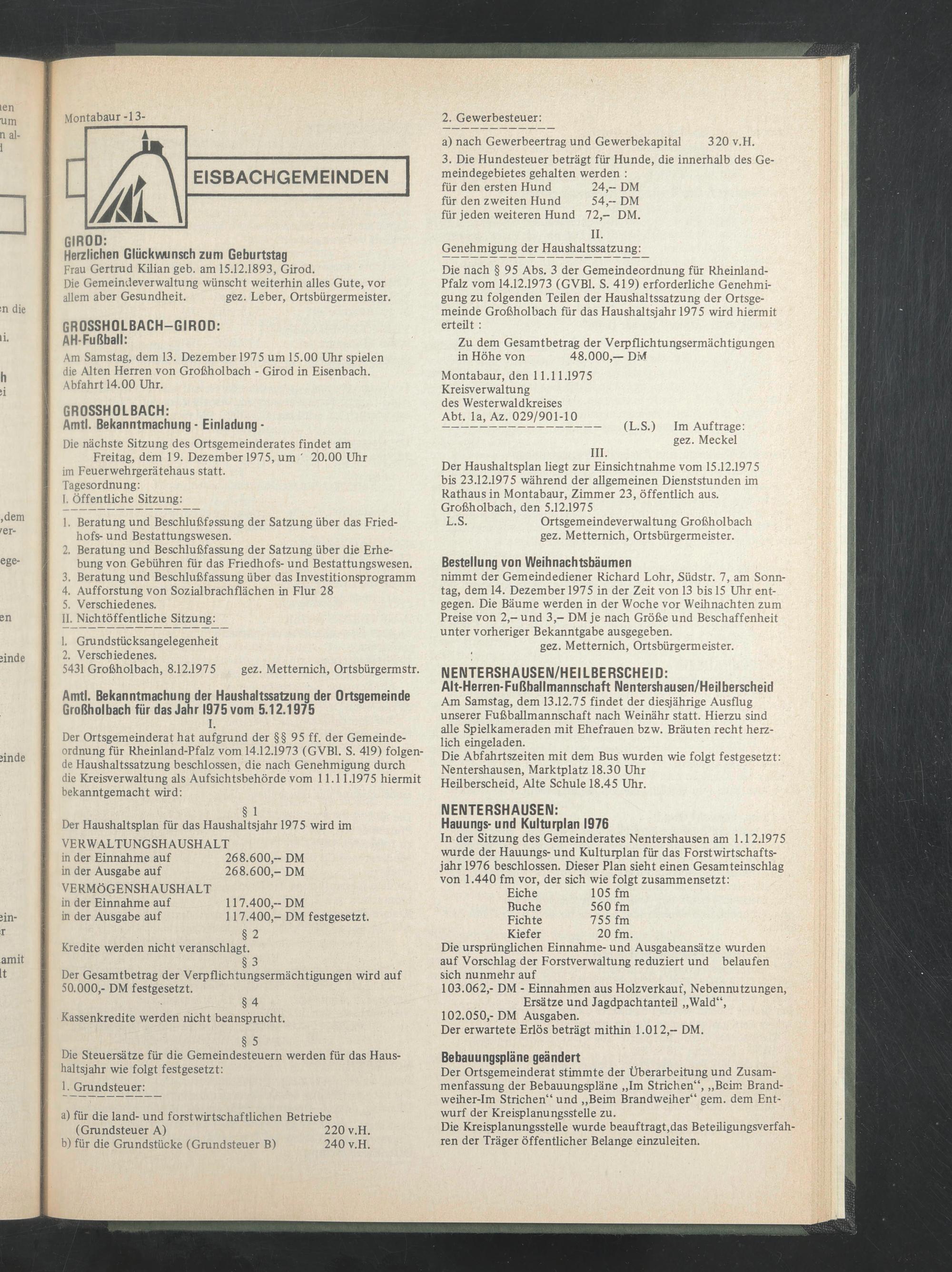 Der Haushaltsplan liegt zur Einsichtnahme vom 15.12.1975 bis 23.12.1975 während der allgemeinen Dienststunden im Rathaus in Montabaur, Zimmer 23, öffentlich aus. Großholbach, den 5.12.1975