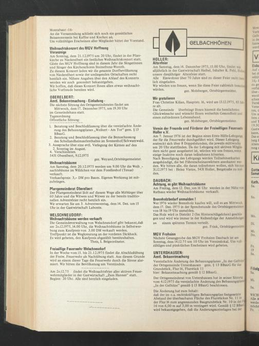 Die Gemeindeverwaltung von Welschneudorf gibt bekannt,daß am 2o.12.1975,14.00 Uhr, die Weihnachtsbäume in Selbstwerbung zum Kaufpreis von 3.00 DM verkauft werden.