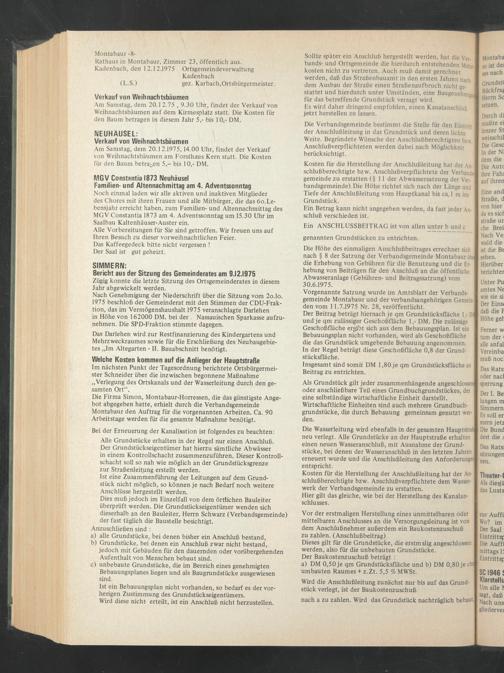 Am Samstag, dem 20.12.75 , 9.30 Uhr, findet der Verkauf von Weihnachtsbäumen auf dem Kirmesplatz statt. Die Kosten für den Baum betragen in diesem Jahr 5,- bis 10,- DM.