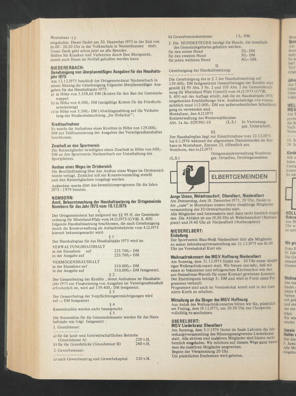Amtl. Bekanntmachung der Haushaltssatzung der Ortsgemeinde Nomborn für das Jahr 1975 vom 10.12.1975