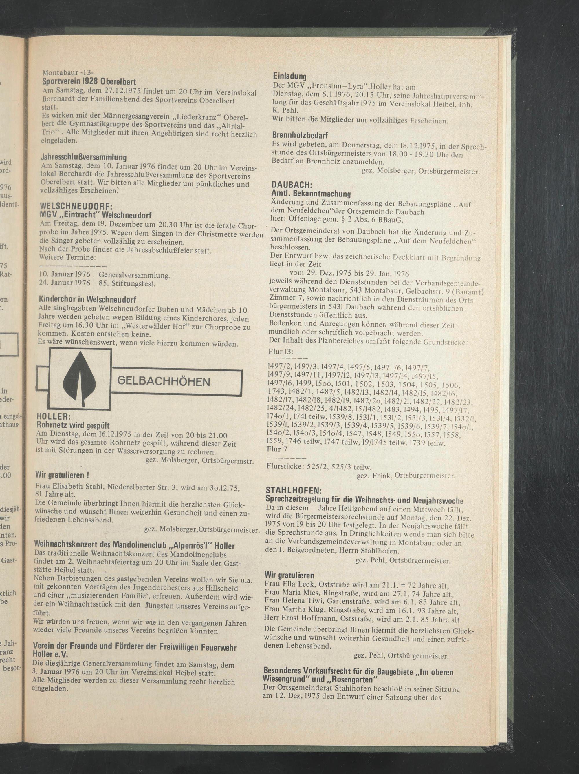 Da in diesem Jahre Heiligabend auf einen Mittwoch fällt, wird die Bürgermeistersprechstunde auf Montag, den 22. Dez. 1975 von 19 bis 20 Uhr festgelegt. In der Neujahrswoche fällt die Sprechstunde aus. In Dringlichkeiten wende man sich bitte an die Verbandsgemeindeverwaltung in Montabaur oder an den I. Beigeordneten, Herrn Stahlhofen.