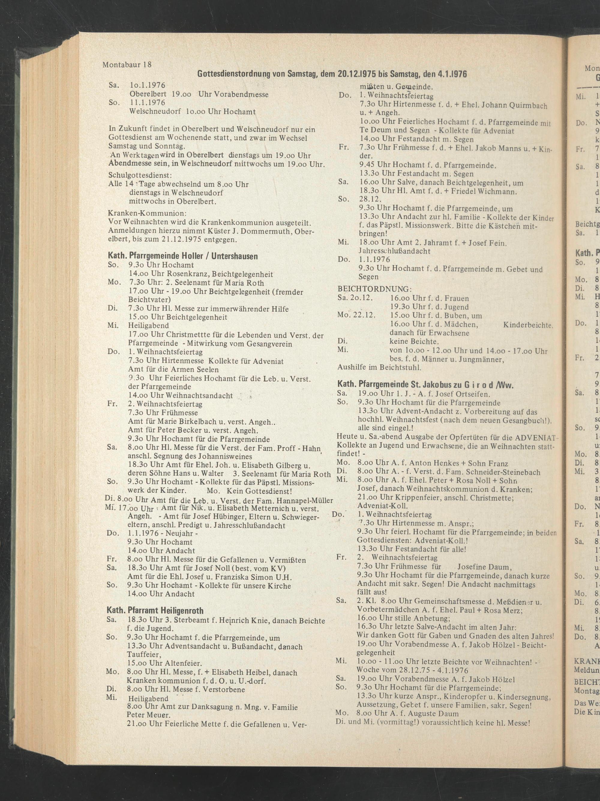 Gottesdienstordnung von Samstag, dem 20.12.1975 bis Samstag, den 4.1.1976