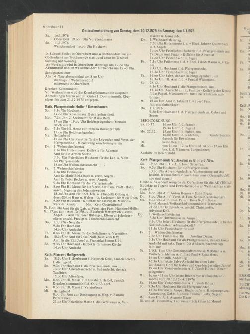 Mi. lo.oo - 11 .oo Uhr letzte Beichte vor Weihnachten! - Woche vom 28.12.75 - 4.1.1976 Sa. 19.oo Uhr Vorabendmesse A. f. Jakob Holzel So. 9.3o Uhr Hochamt für die Pfarrgemeinde;