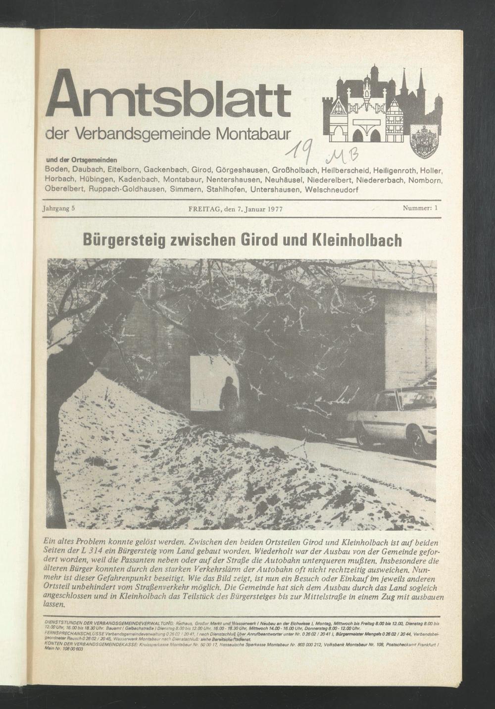 Ein altes Problem konnte gelöst werden. Zwischen den beiden Ortsteilen Girod und Kleinholbach ist auf beiden Seiten der L 314 ein Bürgersteig vom Land gebaut worden. Wiederholt war der Ausbau von der Gemeinde gefordert worden, weil die Passanten neben oder auf der Straße die Autobahn unterqueren mußten. Insbesondere die älteren Bürger konnten durch den starken Verkehrslärm der Autobahn oft nicht rechtzeitig ausweichen. Nunmehr ist dieser Gefahrenpunkt beseitigt. Wie das Bild zeigt, ist nun ein Besuch oder Einkauf im jeweils anderen Ortsteil unbehindert vom Straßenverkehr möglich. Die Gemeinde hat sich dem Ausbau durch das Land sogleich angeschlossen und in Kleinholbach das Teilstück des Bürgersteiges bis zur Mittelstraße in einem Zug mit ausbauen lassen.