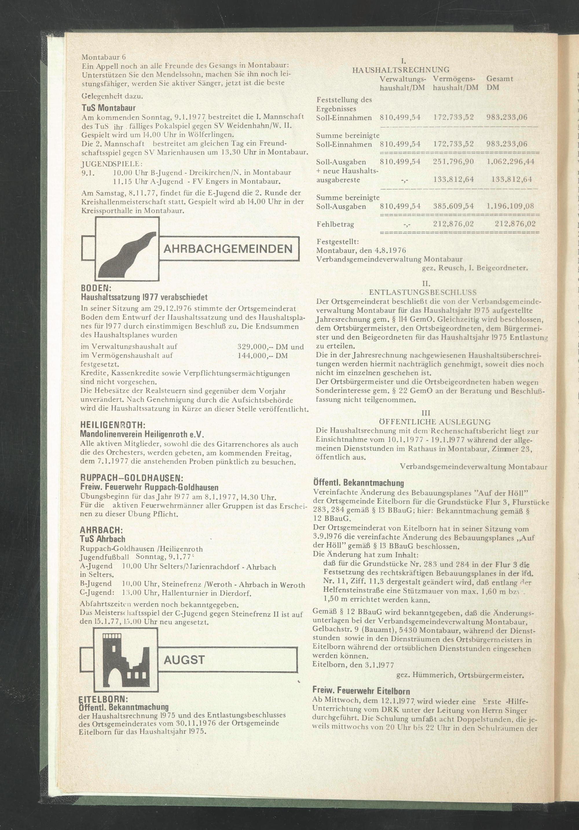 der Haushaltsrechnung 1975 und des Entlastungsbeschlusses des Ortsgemeinderates vom 30.11.1976 der Ortsgemeinde Eitelborn für das Haushaltsjahr 1975.