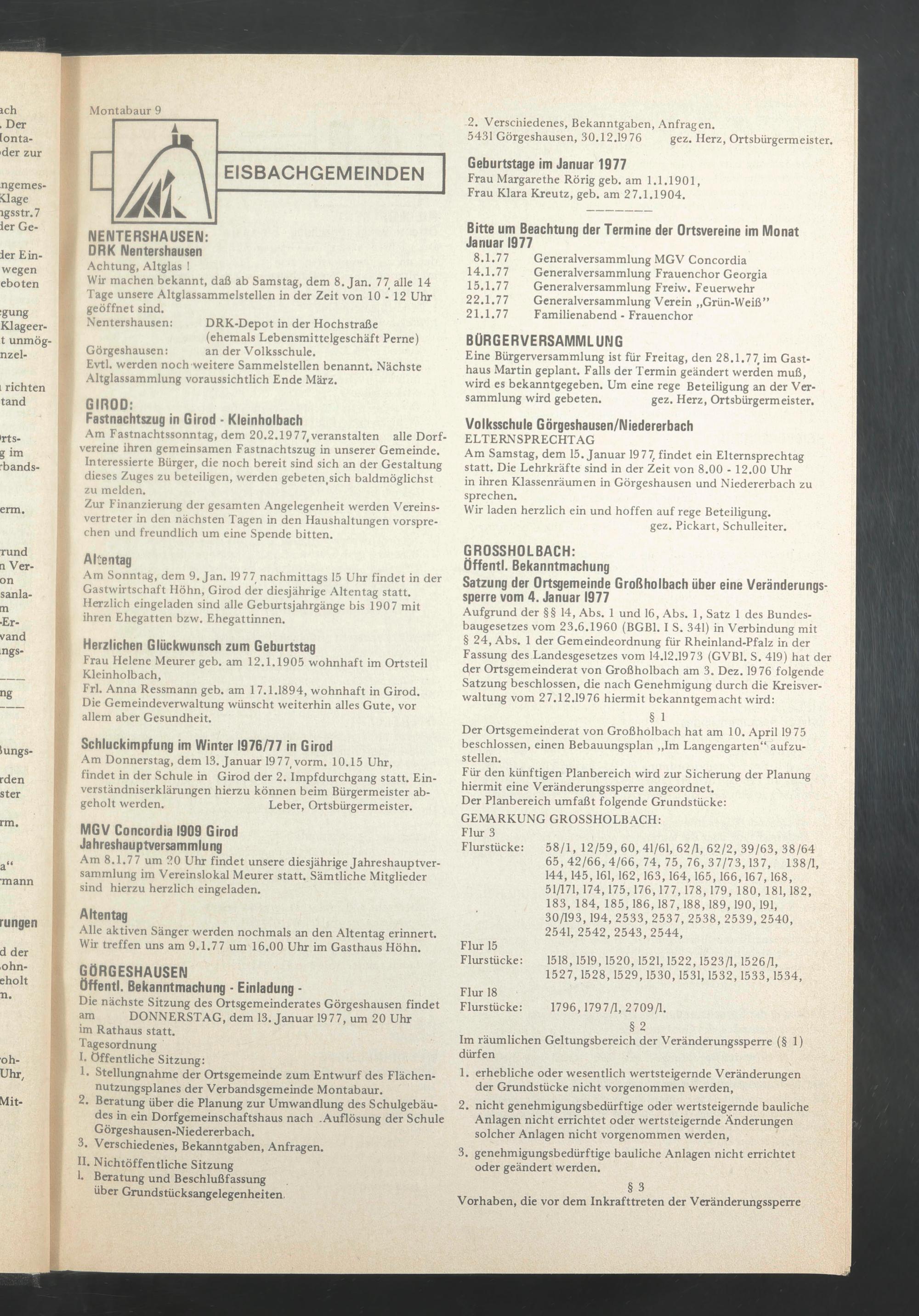 Eine Bürgerversammlung ist für Freitag, den 28.1.77, im Gasthaus Martin geplant. Falls der Termin geändert werden muß, wird es bekanntgegeben. Um eine rege Beteiligung an der Versammlung wird gebeten. gez. Herz, Ortsbürgermeister.