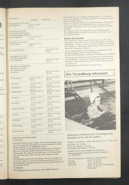 Der Sperrmüll muß für den Abtransport soweit als möglich verpackt sein, damit ein schnelles Verladen gewährleistet ist. Die Sperrmüllabfuhr beginnt jeweils um 6.00 Uhr. Jede Straße wird nur einmal befahren, y Altpapier: