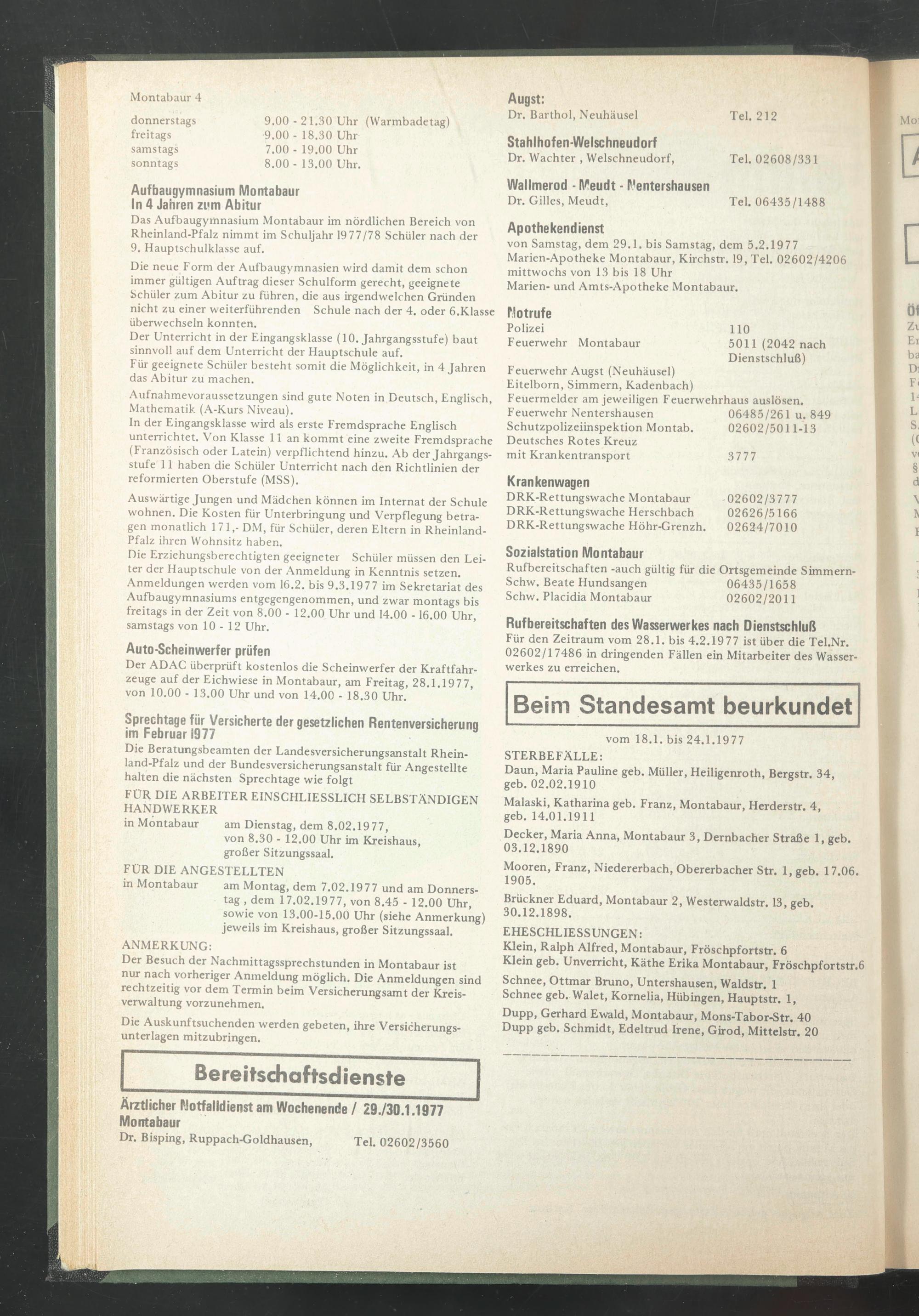 von Samstag, dem 29.1. bis Samstag, dem 5.2.1977 Marien-Apotheke Montabaur, Kirchstr. 19, Tel. 02602/4206 mittwochs von 13 bis 18 Uhr Marien- und Amts-Apotheke Montabaur.
