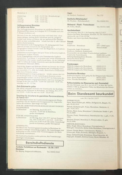 Für den Zeitraum vom 28.1. bis 4.2.1977 ist über die Tel.Nr. 02602/17486 in dringenden Fällen ein Mitarbeiter des Wasserwerkes zu erreichen.