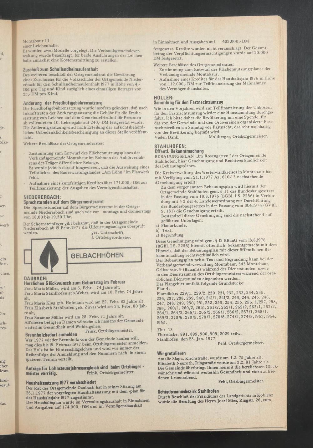 Der Rat der Ortsgemeinde Daubach hat in seiner Sitzung am 26.1.1977 der vorgelegten Haushaltssatzung mit dem -plan für das Haushaltsjahr 1977 zugestimmt.
