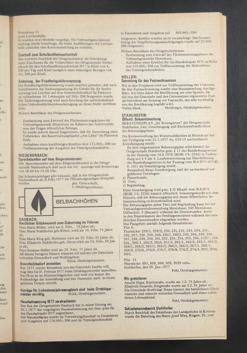 Wer 1977 wieder Brennholz von der Gemeinde kaufen will, mag dies bis 15. Februar 1977 beim Ortsbürgermeister anmelden. Das Holz ist im Hinterschlägelchen und wird wie immer der Reihenfolge der Anmeldung und den Nummern nach in einem späteren Termin verteilt.