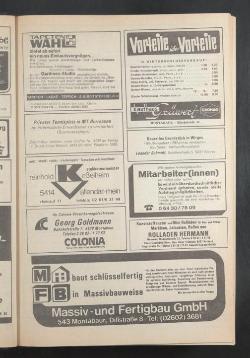 Zuschriften erbeten unter Chiffre Nr. 4130 an Verlag + Druck Linus Wittich, 5413 Bendorf Postfach 1205.