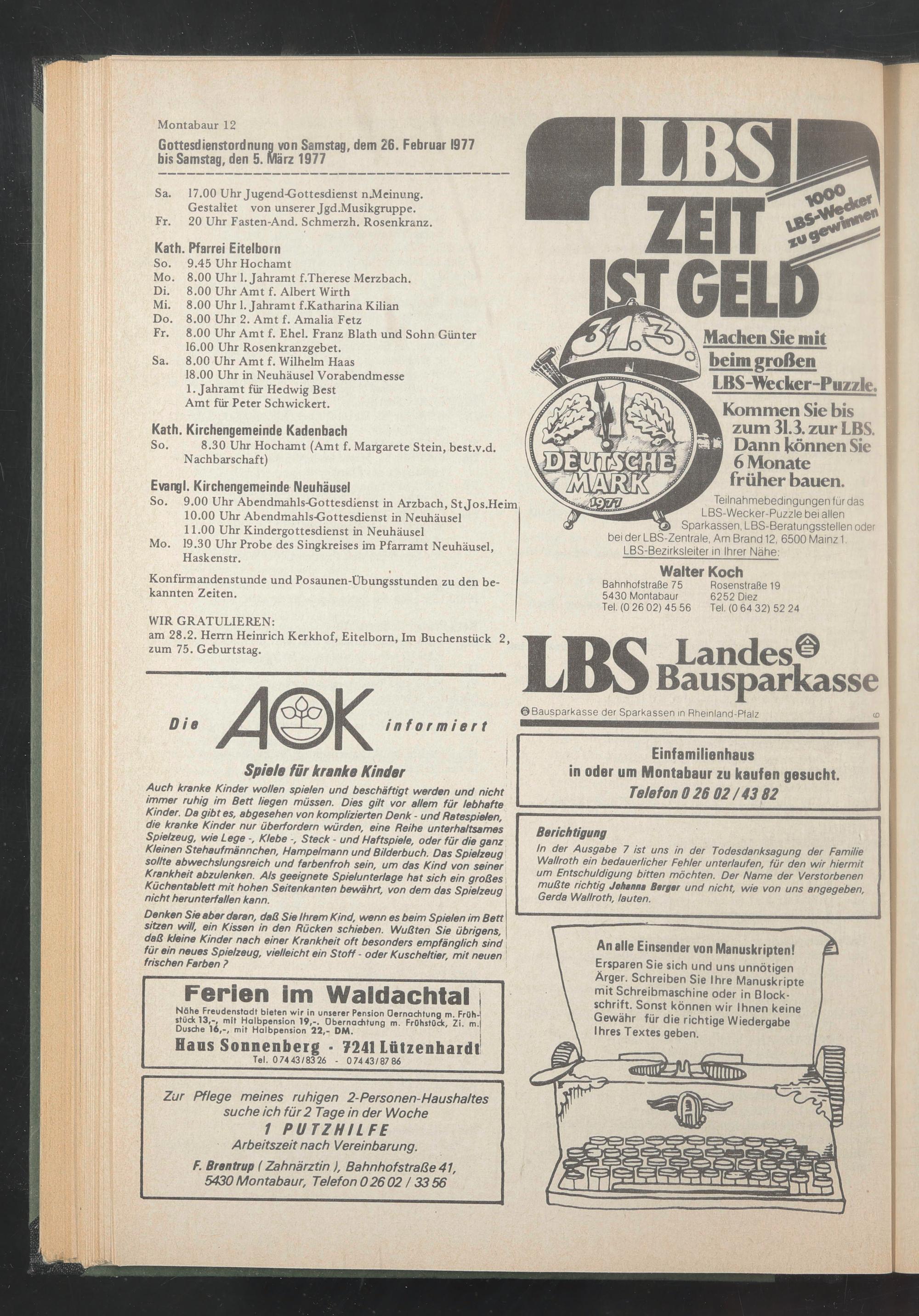 am 28.2. Herrn Heinrich Kerkhof, Eitelborn, Im Buchenstück 2, zum 75. Geburtstag.