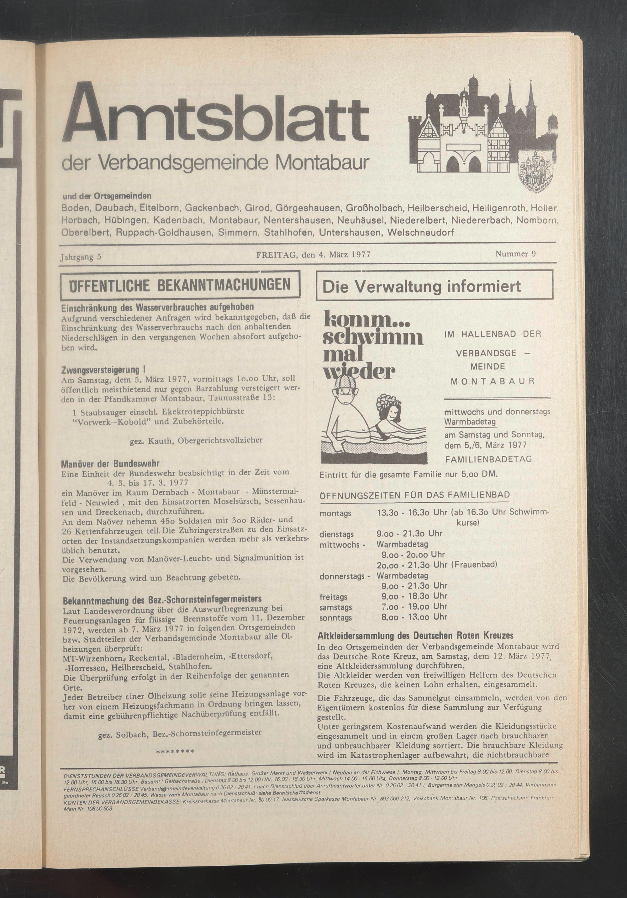 Laut Landesverordnung über die Auswurfbegrenzung bei Feuerungsanlagen für flüssige Brennstoffe vom 11. Dezember 1972, werden ab 7. März 1977 in folgenden Ortsgemeinden bzw. Stadtteilen der Verbandsgemeinde Montabaur alle Ölheizungen überprüft: