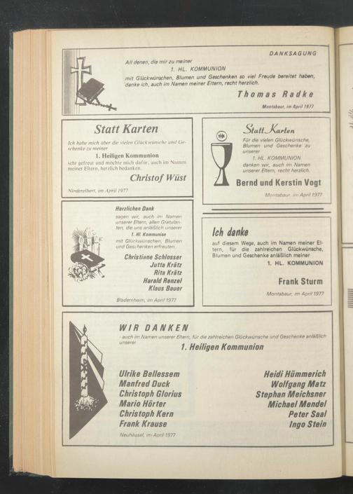 sagen wir, auch im Namen unserer Eltern, allen Gratulanten, die uns anläßlich unserer 1. Hl. Kommunion mit Glückwünschen, Blumen und Geschenken erfreuten.