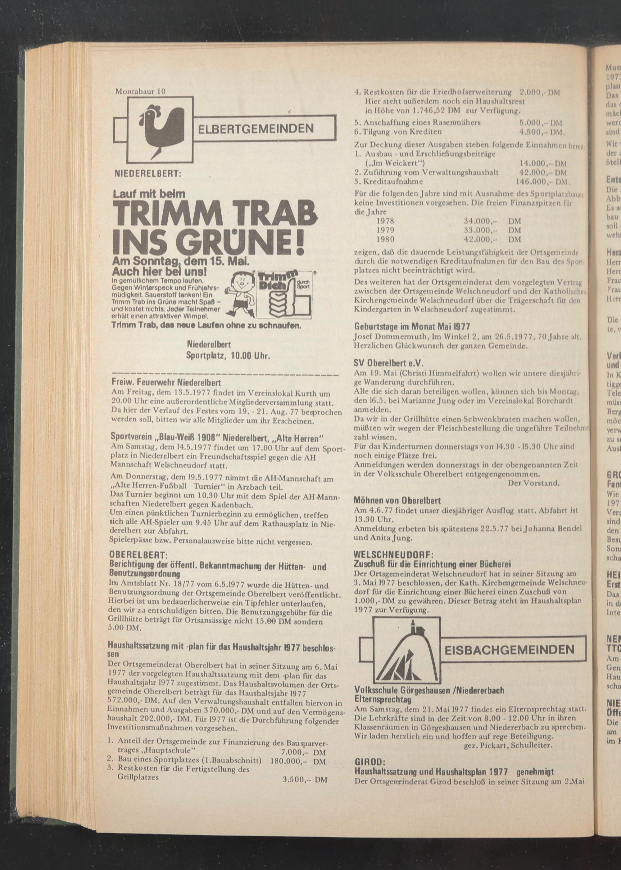 Der Ortsgemeinderat Oberelbert hat in seiner Sitzung am 6. Mai 1977 der vorgclegten Haushaltssatzung mit dem -plan für das Haushaltsjahr 1977 zugestimmt. Das Haushaltsvolumen der Ortsgemeinde Oberelbert beträgt für das Haushaltsjahr 1977 572.000,- DM. Auf den Verwaltungshaushalt entfallen hiervon in Einnahmen und Ausgaben 3 70.000,- DM und auf den Vcrmögens- haushalt 202.000,- DM. Für 1977 ist die Durchführung folgender Investitionsmaßnahmen vorgesehen.