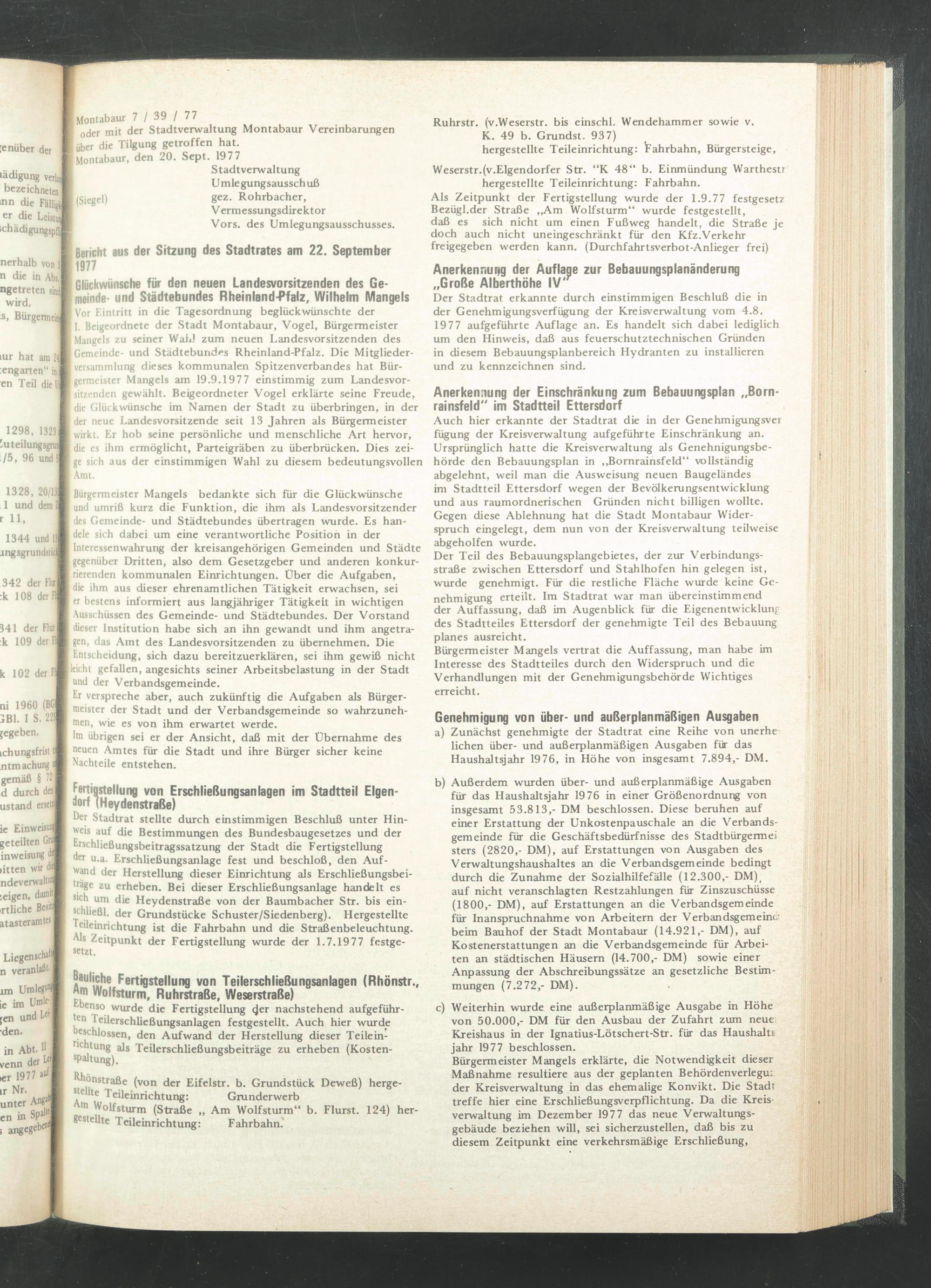 Vor Eintritt in die Tagesordnung beglückwünschte der 1, Beigeordnete der Stadt Montabaur, Vogel, Bürgermeister Mangels zu seiner Wahl zum neuen Landesvorsitzenden des Gemeinde- und Städtebundes Rheinland-Pfalz. Die Mitgliederversammlung dieses kommunalen Spitzenverbandes hat Bürgermeister Mangels am 19.9.1977 einstimmig zum Landesvorsitzenden gewählt. Beigeordneter Vogel erklärte seine Freude, die Glückwünsche im Namen der Stadt zu überbringen, in der der neue Landesvorsitzende seit 13 Jahren als Bürgermeister wirkt. Er hob seine persönliche und menschliche Art hervor, die es ihm ermöglicht, Parteigräben zu überbrücken. Dies zeige sich aus der einstimmigen Wahl zu diesem bedeutungsvollen Amt.