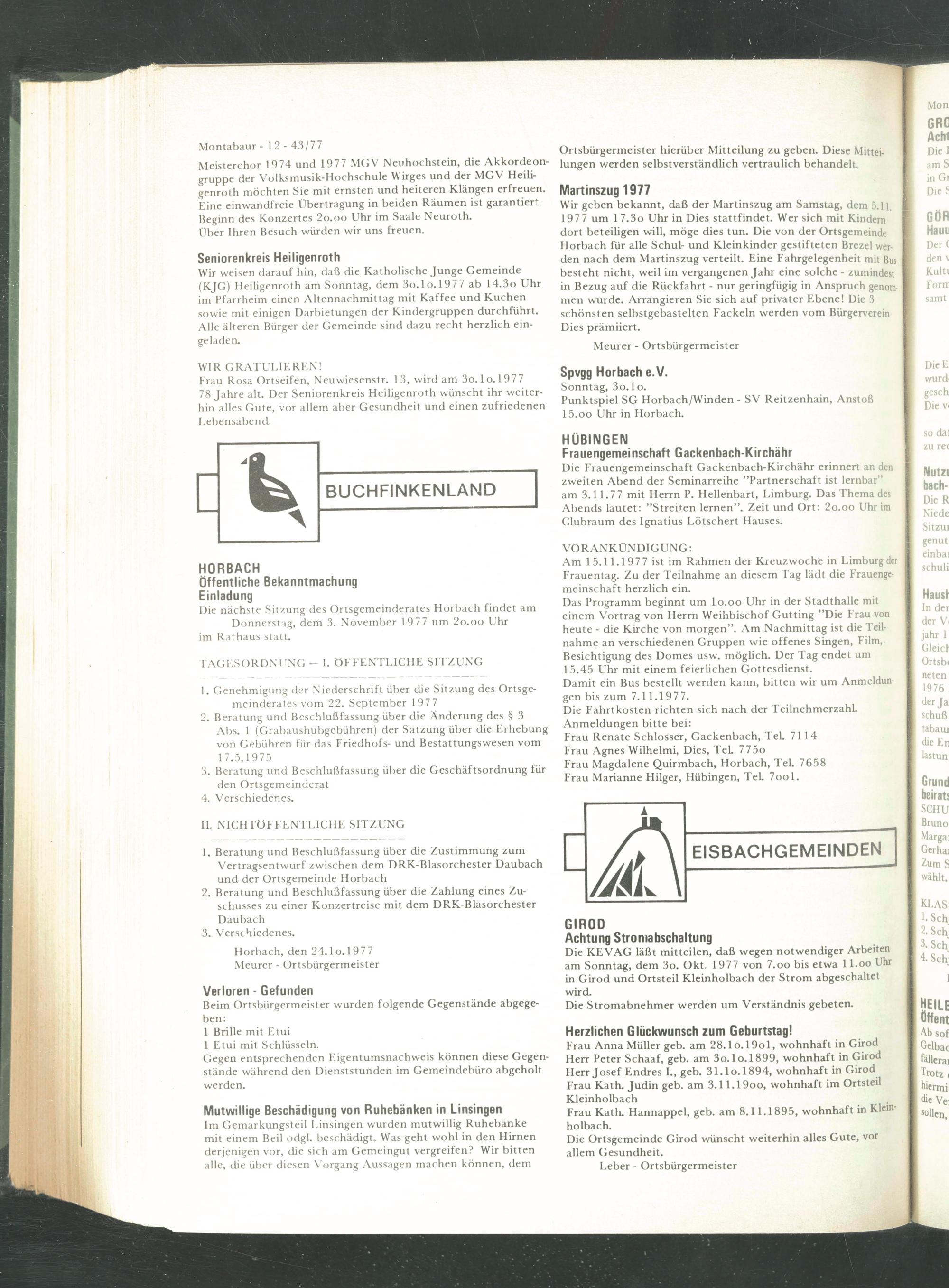 Die nächste Sitzung des Ortsgemeinderates Horbach findet am Donnerstag, dem 3. November 1977 um 2o.oo Uhr im Rathaus statt.