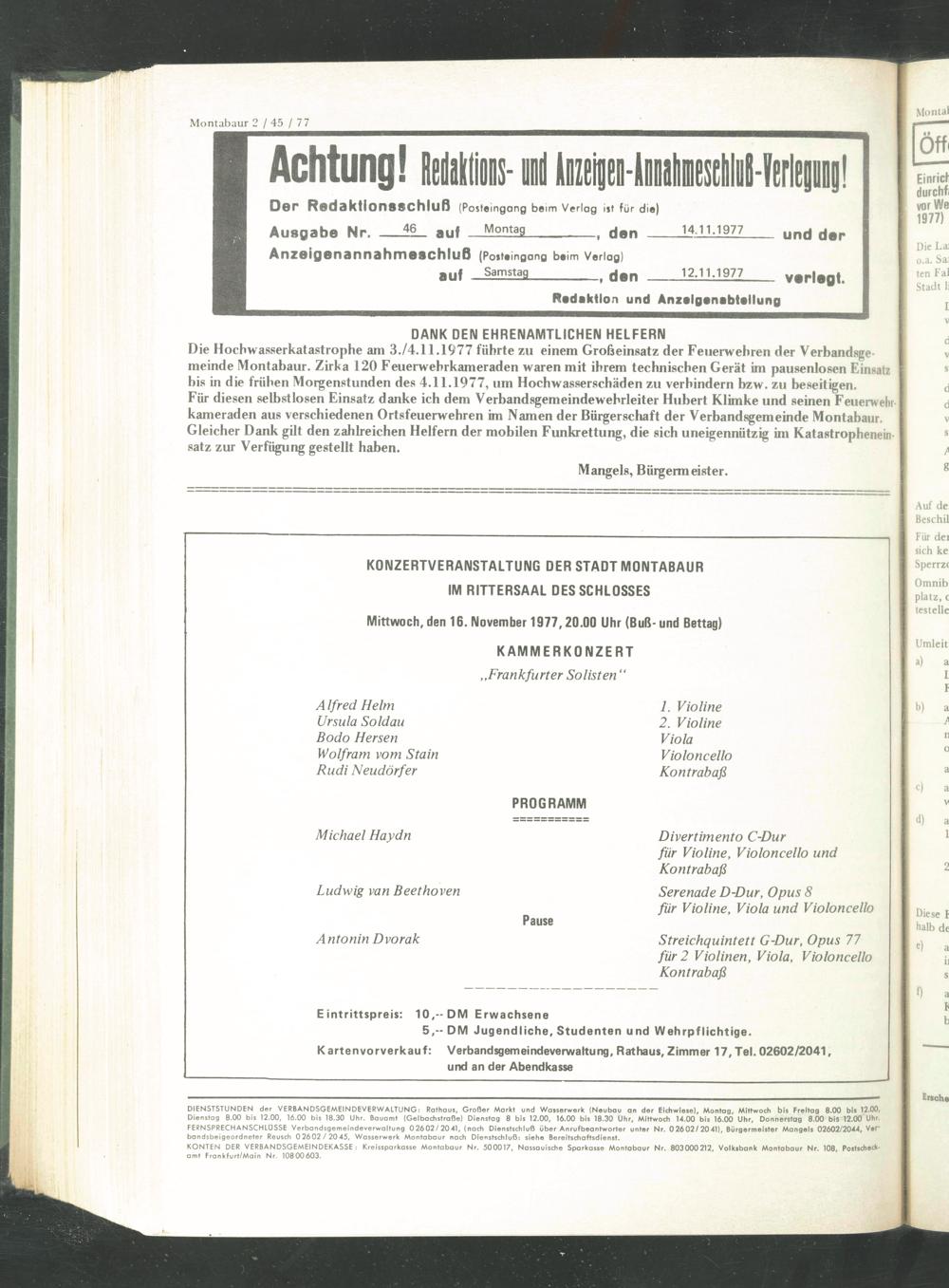 Die Hochwasserkatastrophe am 3./4.11.1977 führte zu einem Großeinsatz der Feuerwehren der Verbandsgemeinde Montabaur. Zirka 120 Feuerwehrkameraden waren mit ihrem technischen Gerät im pausenlosen Einsatz bis in die frühen Morgenstunden des 4.11.1977, um Hochwasserschäden zu verhindern bzw. zu beseitigen.