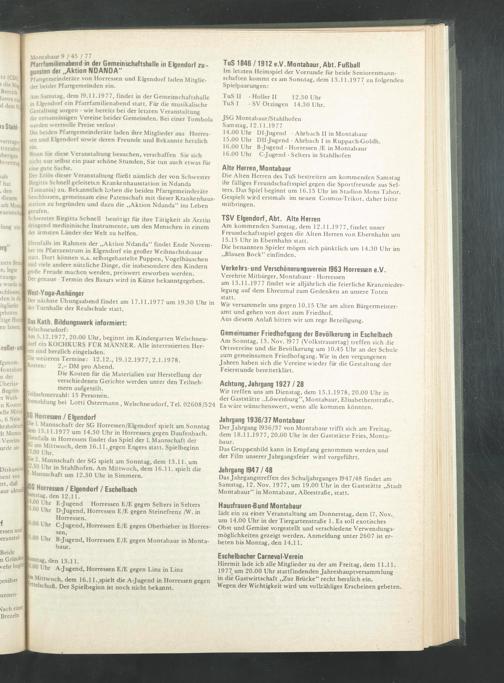 Am Samstag, dem 19.11.1977, findet in der Gemeinschaftshalle in Eigendorf ein Pfarrfamilienabend statt. Für die musikalische Gestaltung sorgen - wie bereits bei der letzten Veranstaltung die ortsansässigen Vereine beider Gemeinden. Bei einer Tombola werden wertvolle Preise verlost.