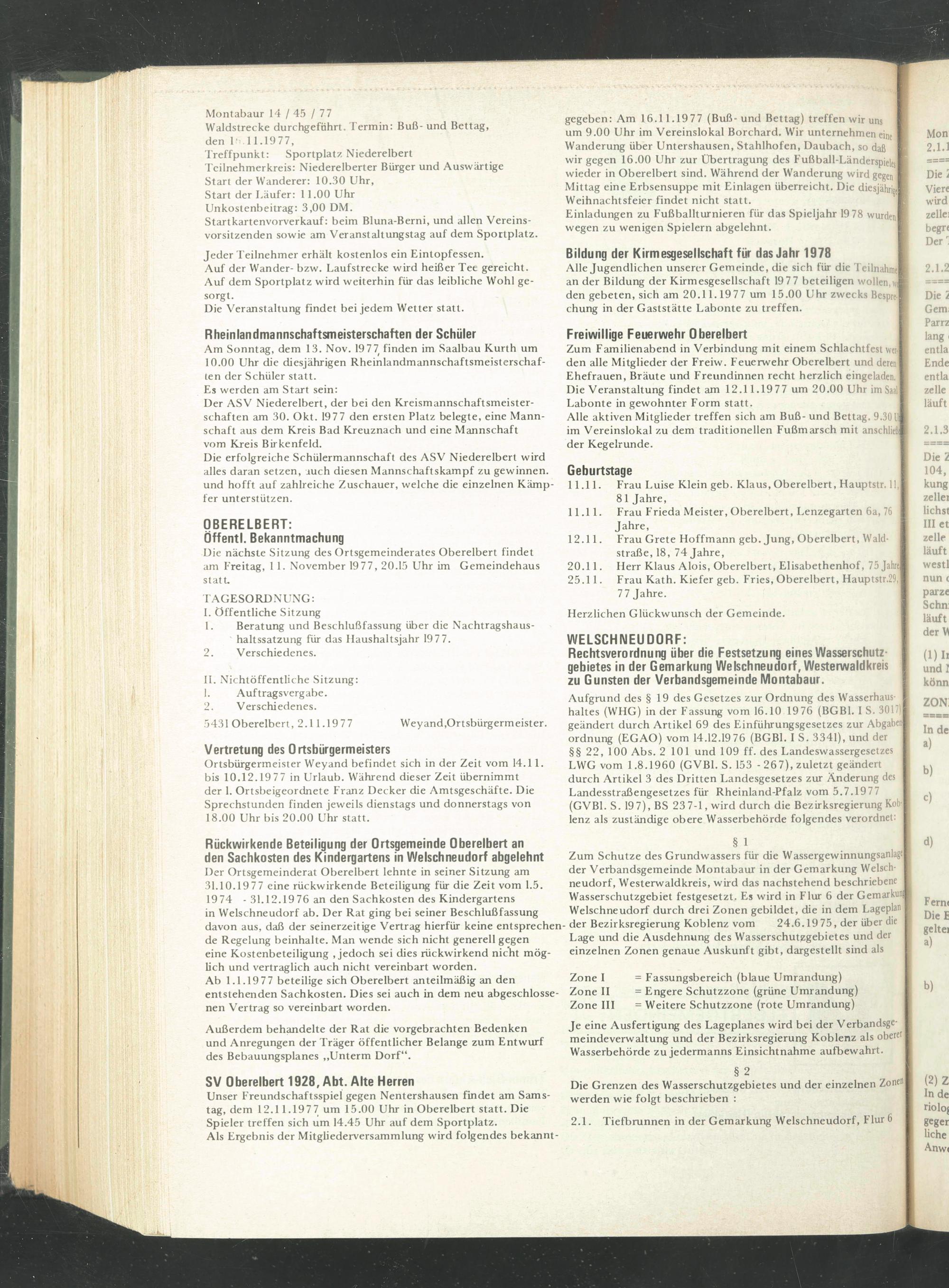 Ortsbürgermeister Weyand befindet sich in der Zeit vom 14.11. bis 10.12.1977 in Urlaub. Während dieser Zeit übernimmt der 1. Ortsbeigeordnete Franz Decker die Amtsgeschäfte. Die Sprechstunden finden jeweils dienstags und donnerstags von 18.00 Uhr bis 20.00 Uhr statt.