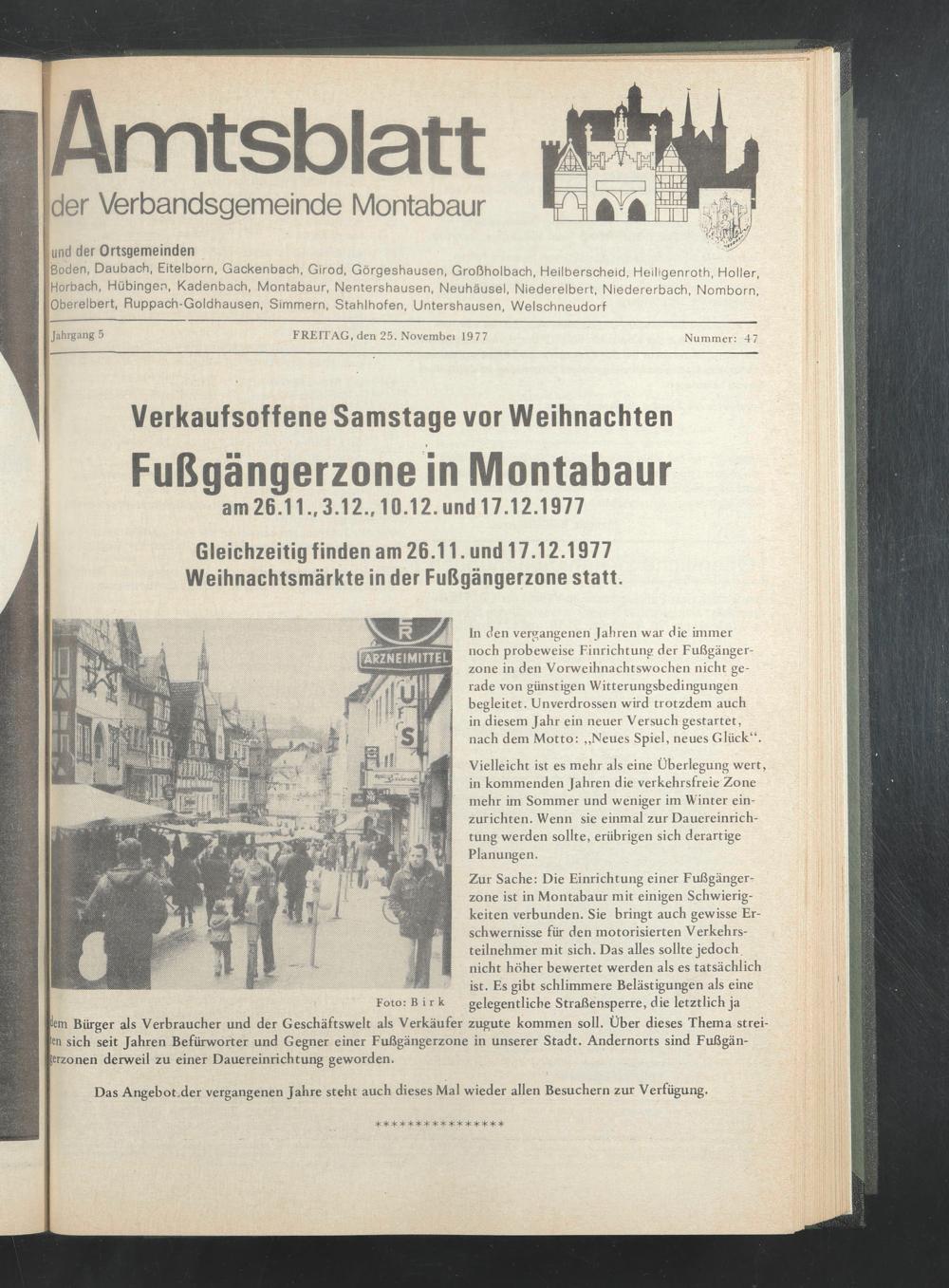 Gleichzeitig finden am 26.11. und 17.12.1977 Weihnachtsmärkte in der Fußgängerzone statt.