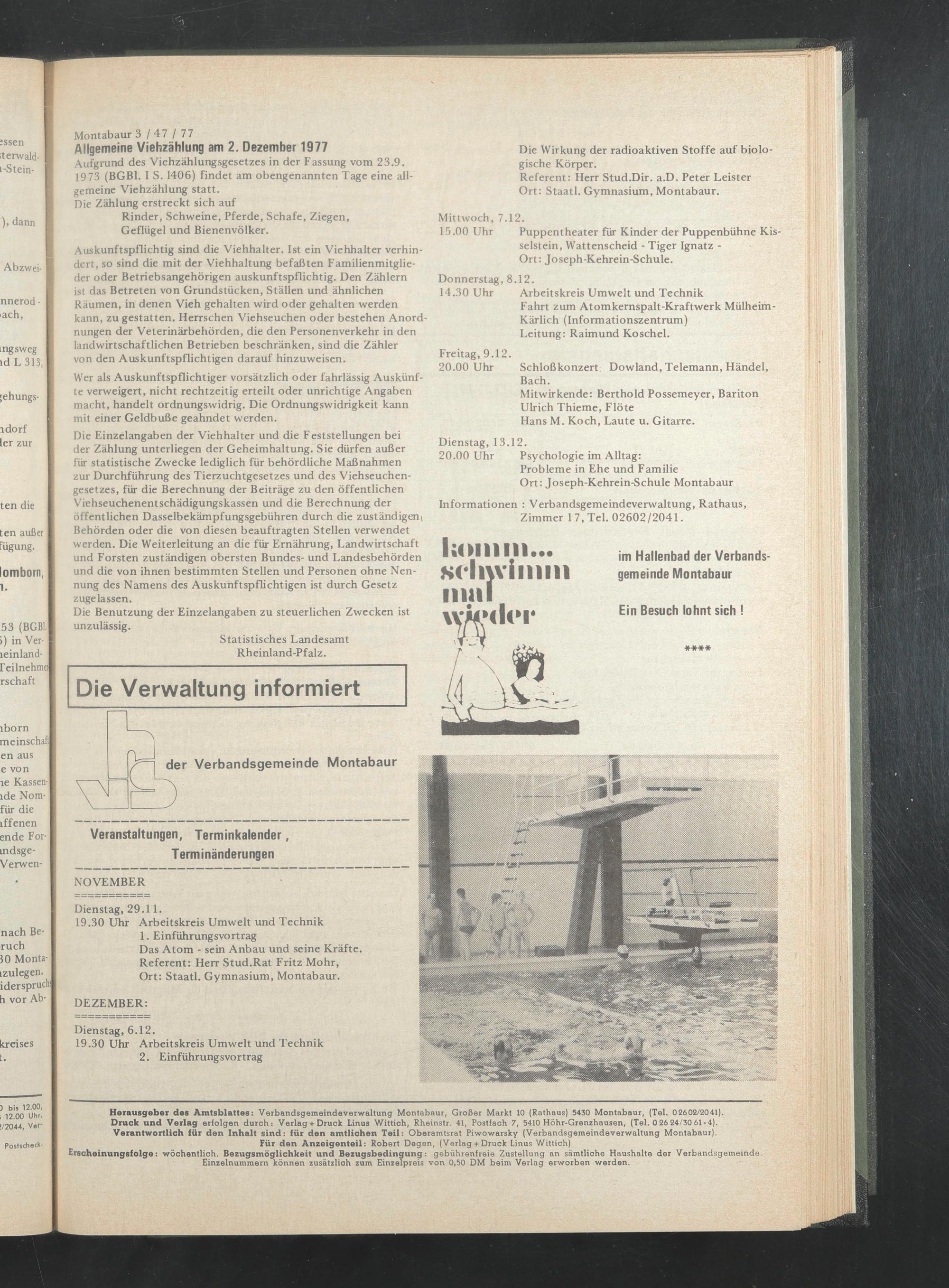Druck und Verlag erfolgen durch: Verlag + Druck Linus Wittich, Rheinstr. 41, Postfach 7, 5410 Höhr-Grenzhausen, (Tel. 02624/3061-4). Verantwortlich für den Inhalt sind: für den amtlichen Teil: Oberamtsrat Piwowarsky (Verbandsgemeindeverwaltung Montabaur).