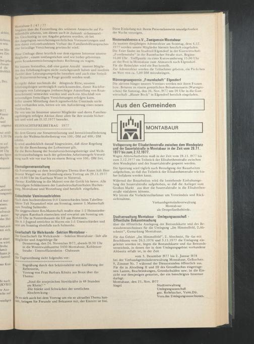 Vollsperrung der Elisabethenstraße zwischen dem Wendeplatz und der Sauertalstraße in Montabaur in der Zeit vom 28.11. 1977 bis zum 2.12.1977.