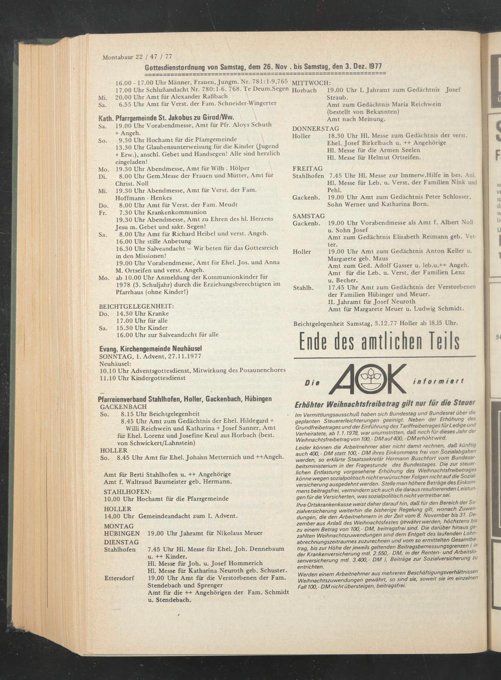 Gottesdienstordnung von Samstag, dem 26. Nov . bis Samstag, den 3. Dez. 1977