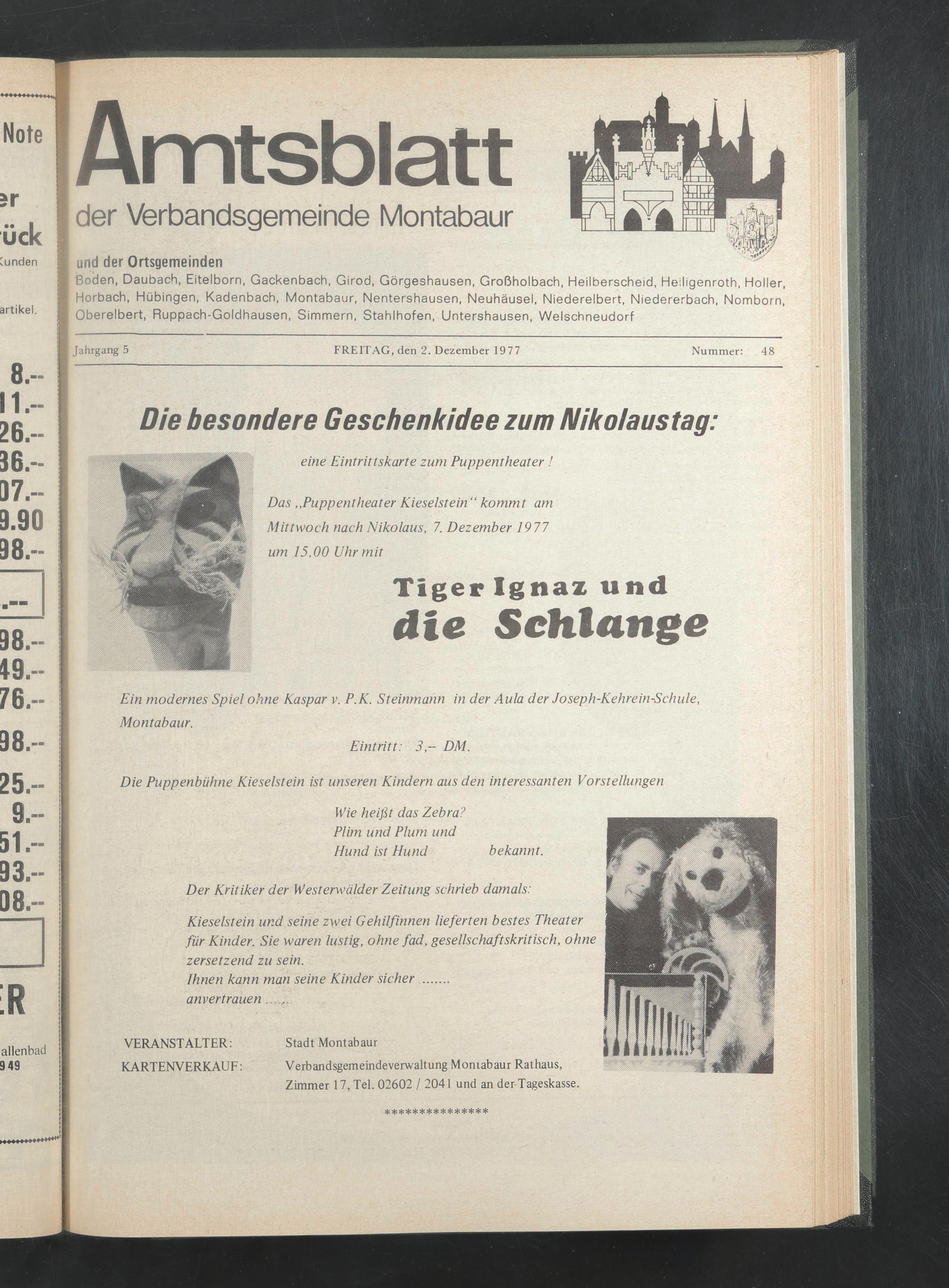 Das ,,Puppentheater Kieselstein “ kommt am Mittwoch nach Nikolaus, 7. Dezember 1977 um 15.00 Uhr mit