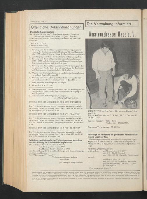 am Montag, dem 19.12.1977 von 8.45 - 12.00 Uhr bei der Verbandsgemeindeverwaltung (Rathaus) I. Stock, gr. Sitzungssaal.