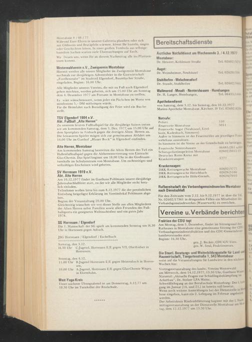Für den Zeitraum vom 2.12. bis 9.12.1977 ist über die Tel. Nr. 02602/17361 in dringenden Fällen ein Mitarbeiter des Verbandsgemeindewerkes (Wasserwerk) zu erreichen.