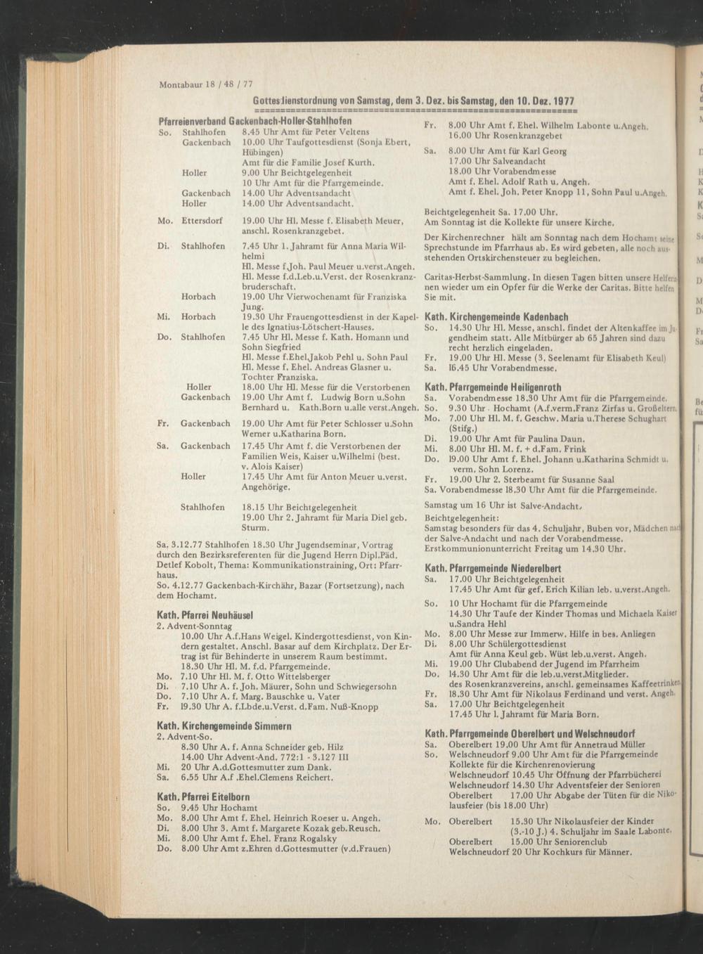 Sa. 3.12.77 Stahlhofen 18.30 Uhr Jugendseminar, Vortrag durch den Bezirksreferenten für die Jugend Herrn Dipl.Päd. Detlef Kobolt, Thema: Kommunikationstraining, Ort: Pfarrhaus.