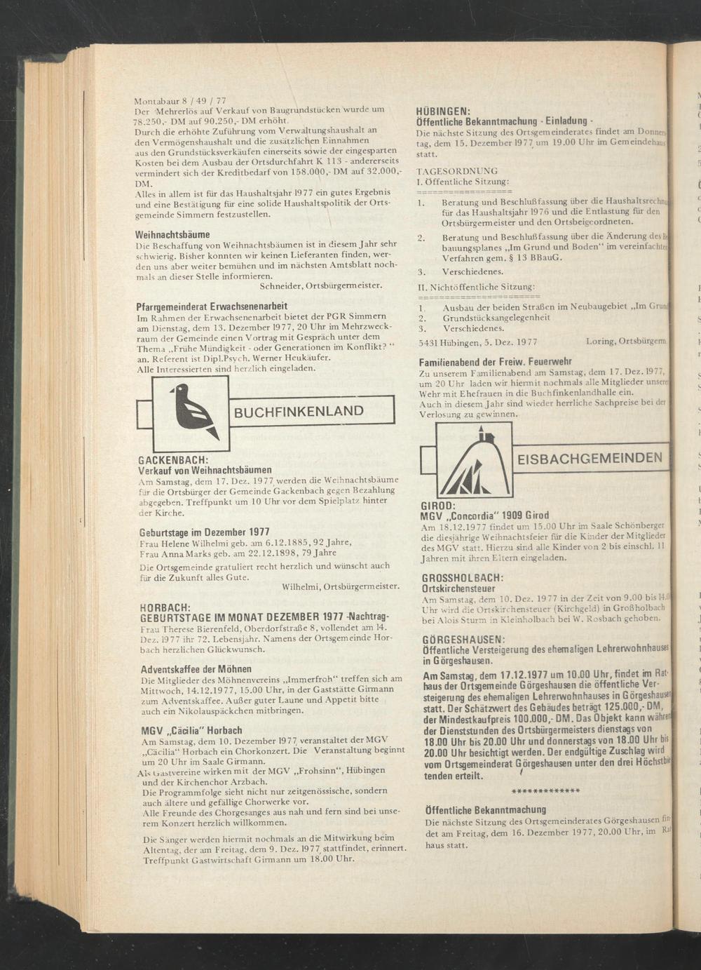 Die nächste Sitzung des Ortsgemeinderates findet am Donner; tag, dem 15. Dezember 1977 um 19.00 Uhr im Gemeindehaus statt.