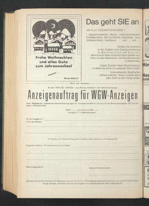 Nach Maßgabe der allgemeinen Geschäftsbedingungen für Anzeigen bestelle (n) ich / wir für die Weihnachtsausgabe 1977 die Anzeige It. Musterkatalog