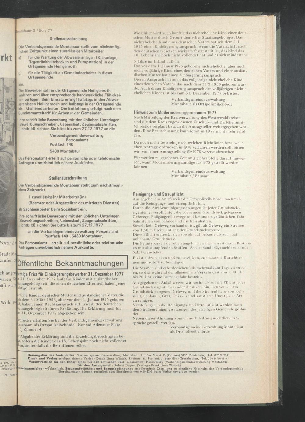 Druck und Verlag erfolgen durch: Verlags-Druck Linus Wittich, Rheinstr. 41, Postfach 7, 5410 Höhr-Grenzhausen, (Tel. 0 26 24/30 61-4). Verantwortlich für den Inhalt sind: für den amtlichen Teil: Oberamtsrat Piwowarsky (Verbandsgemeindeverwaltung Montabaur).