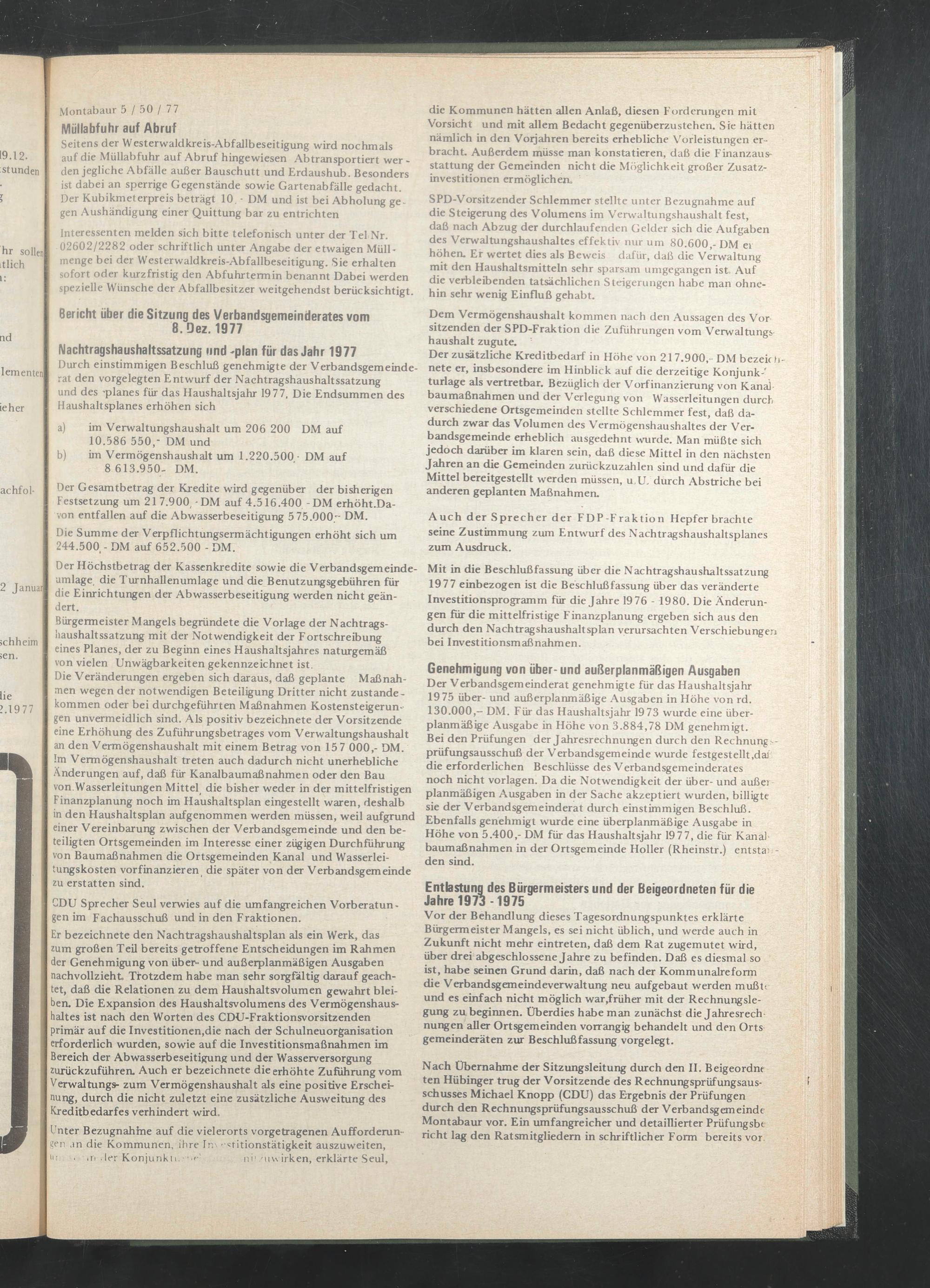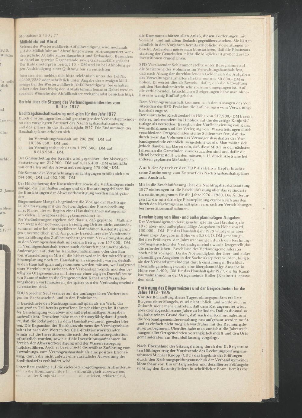 Bericht über die Sitzung des Verbandsgemeinderates vom 8. Dez. 1977