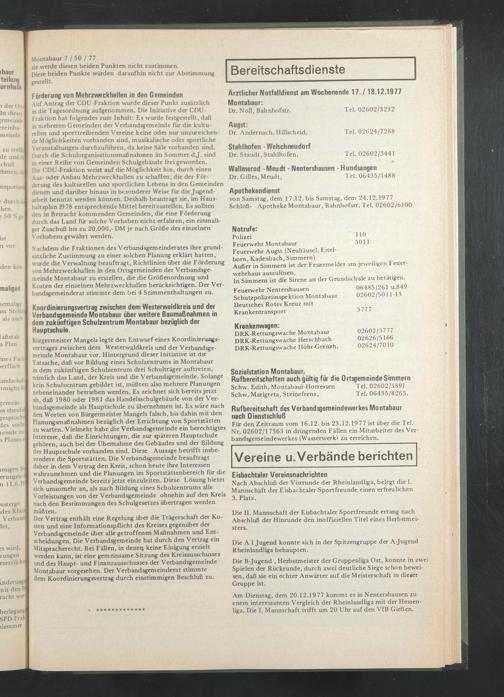Für den Zeitraum vom 16.12. bis 23.12.1977 ist über die Tel. Nr. 02602/17363 in dringenden Fällen ein Mitarbeiter des Verbandsgemeindewerkes (Wasserwerk! zu erreichen.